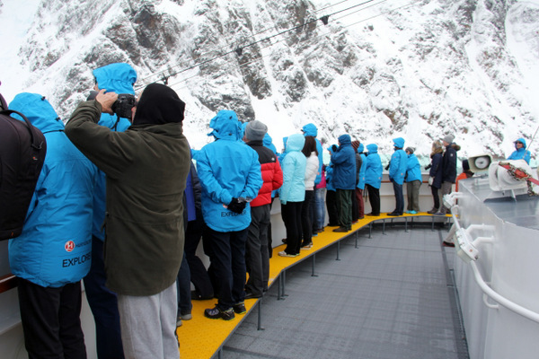 At the "peak economy" cruising speed of 12.5 knots, it's about sixty hours from Ushuaia to Antarctica or vice versa. On the way down, that time is filled handing out jackets and boots and generally getting everyone ready to walk on the ice. Plus, everyone's excited and doesn't care what they do.